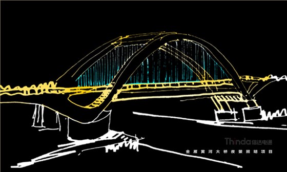 橋體整體為流暢的線條,我們在亮化設計中選用簡約光色勾勒橋體,用燈光來詮釋橋體的靈魂。光色上用黃色或者淡藍色,在照明時可以通過照明控制系統調試不同的展示效果,因為展示效果并不復雜,所以控制系統在功能的采用中選擇穩定、控制效果單一的即可。
