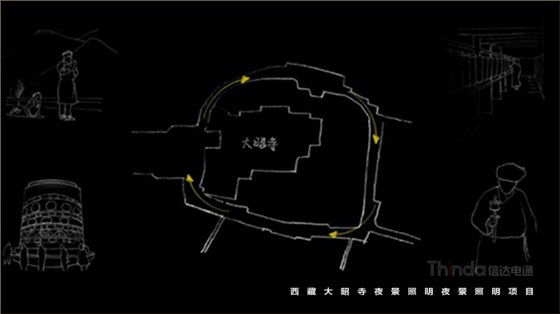 3)重大節(jié)日模式下所有照明燈具全開(kāi),重要節(jié)點(diǎn)投影經(jīng)文開(kāi)啟,使大昭寺成為一個(gè)巨大的轉(zhuǎn)經(jīng)筒與朝拜的人一起緩緩轉(zhuǎn)動(dòng)。