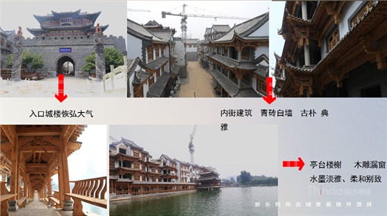 新樂(lè)市雞鳴古城黑瓦白墻、青磚門罩、木雕漏窗與建筑物融為一體,展現(xiàn)徽派建筑的端莊文雅、溫馨別致的藝術(shù)風(fēng)格,展現(xiàn)人行視點(diǎn)的直觀感受。具備古典情調(diào)的雅致,給人們帶來(lái)的是休閑逸致與感官享受。根據(jù)古建筑燈光整體考慮,強(qiáng)化建筑帶給人們的夜間美,打造具有人文自然、觀賞體驗(yàn)、休閑雅致、情感交流的夜間情境式體驗(yàn)氛圍。