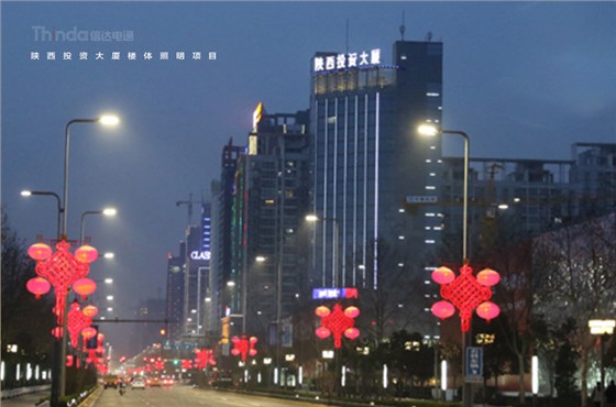 平日模式——隨著夜幕降臨,陜西投資大廈的夜景照明景象也隨之映入眼簾,在上圖中我們可以看到建筑頂部及兩側(cè)采用白色光,加上星星點點的星光燈和建筑底部柔和的黃色燈光,給人一種溫暖而又寧靜的感覺。